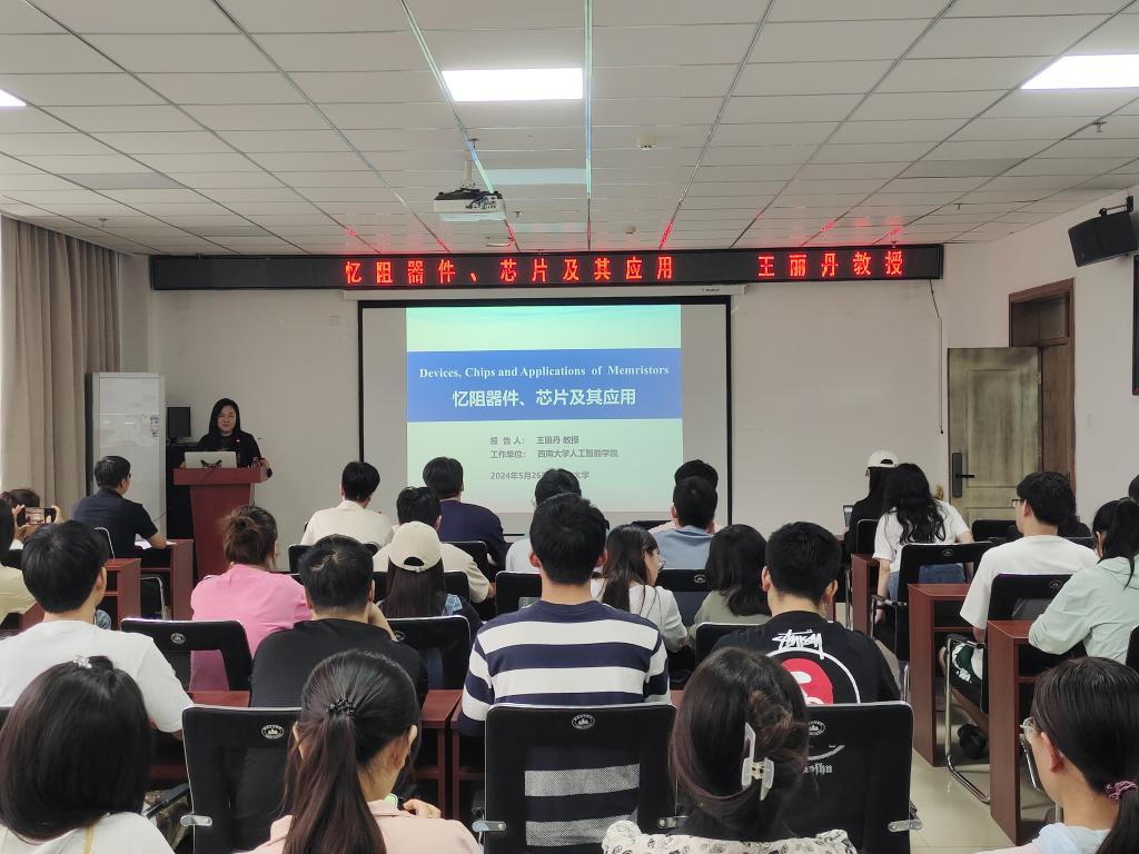 在科学楼B座715会议室成功举办了研究生第20240508期华彩讲坛。本次讲坛特邀西南大学人工智能学院王丽丹教授主讲,主题为《忆阻器件、芯片及其应用》,讲座由杨风暴教授主持,学院广大教师和研究生积极参与了此次讲座。
