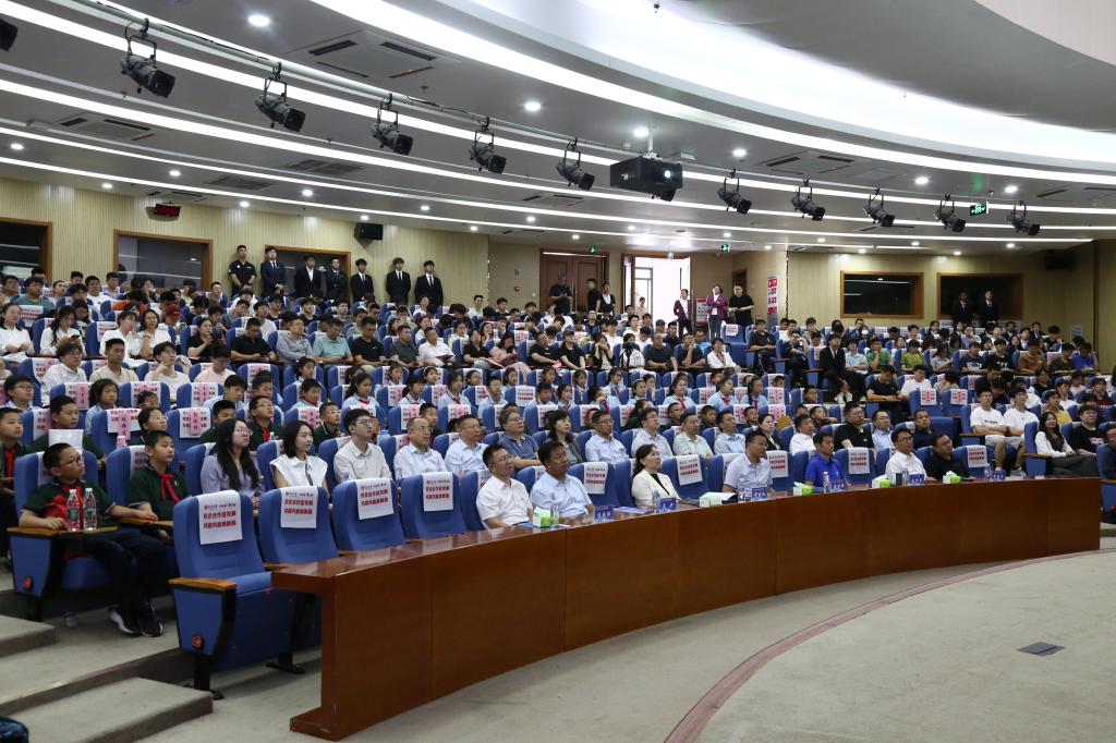 赵传东作航天科普专题讲座。“在学习理论知识的那段日子里,我们的公寓楼总是最晚熄灯的”“在一天的高强度训练结束之后,吃饭的手都在不停的颤抖”,作为中国首批航天员中的一员,他以自己的亲身经历向大家讲述了航天员艰苦的训练生活并带领大家重温了自己当年投身载人航天事业时的宣誓过程。