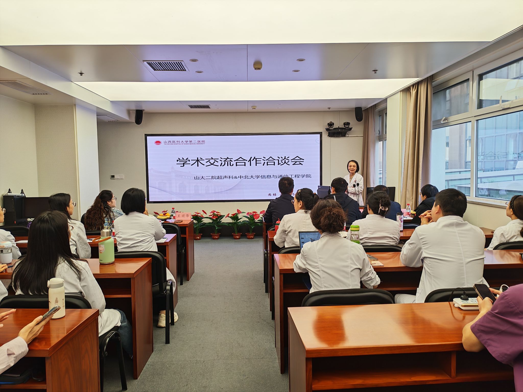 会上,王兴华主任对学院一行的到来表示热烈欢迎,并对山西二院超声科的发展历史及组织架构进行了详细介绍。王黎明院长介绍了学院学科布局、科研平台与人才队伍等方面的情况,并对学院在信息探测、信号处理、智能系统等方向的科研成果应用进行详细说明。