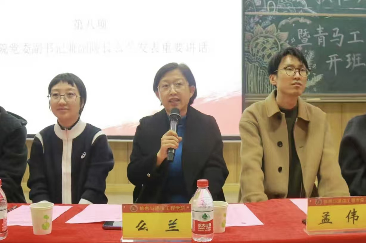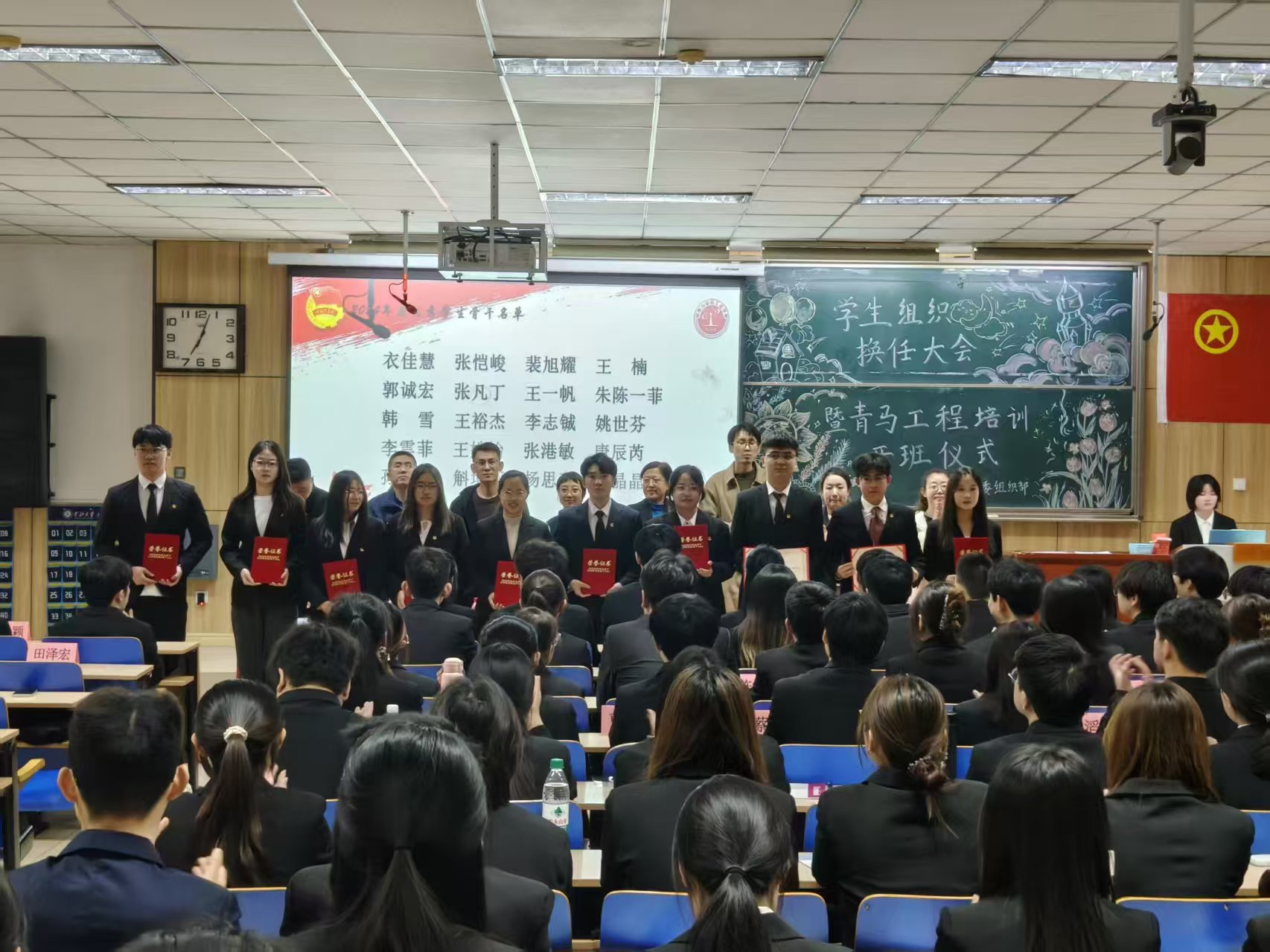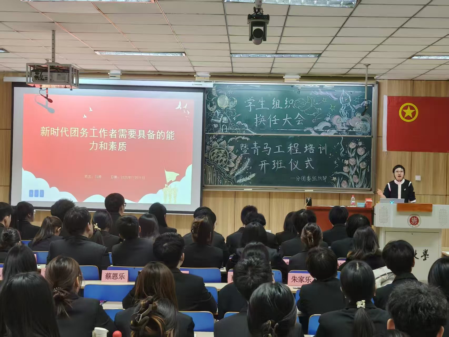 2025年度学生组织换任大会暨青马工程培训开班仪式在09102H教室隆重举行。学院党委副书记兼副院长么兰,团委书记闫婷,学生科孟伟、王秋惠、赵健东、沈晨、左冠华老师及全体学生骨干与青马学员共同出席会议。院团委王彪老师主持仪式。