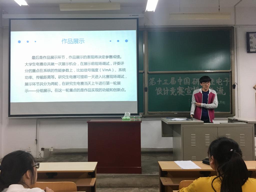在13301室开展了第十三届中国研究生电子设计竞赛宣讲及交流活动。学院科研院长王明泉教授、王建萍老师、上届参赛获奖团队代表出席了本次活动。