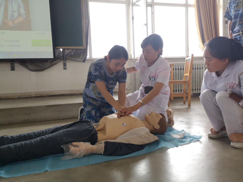 勾医生用通俗易懂的语言说明了学习心脏复苏术的意义,并为同学们讲解了心肺复苏的各个步骤。为了能让大家更好地掌握心肺复苏的技术要点和正确的操作手法,勾医生及护士用人体模型进行演示,并现场指导参加讲座的同学进行操作演练。勾医生说,当出现需要做心脏复苏的情况时,学习过心脏复苏的同学都要对自己有自信,及时去帮助他人。现场的同学们积极参与实践操作,深刻领会了急救的要领。