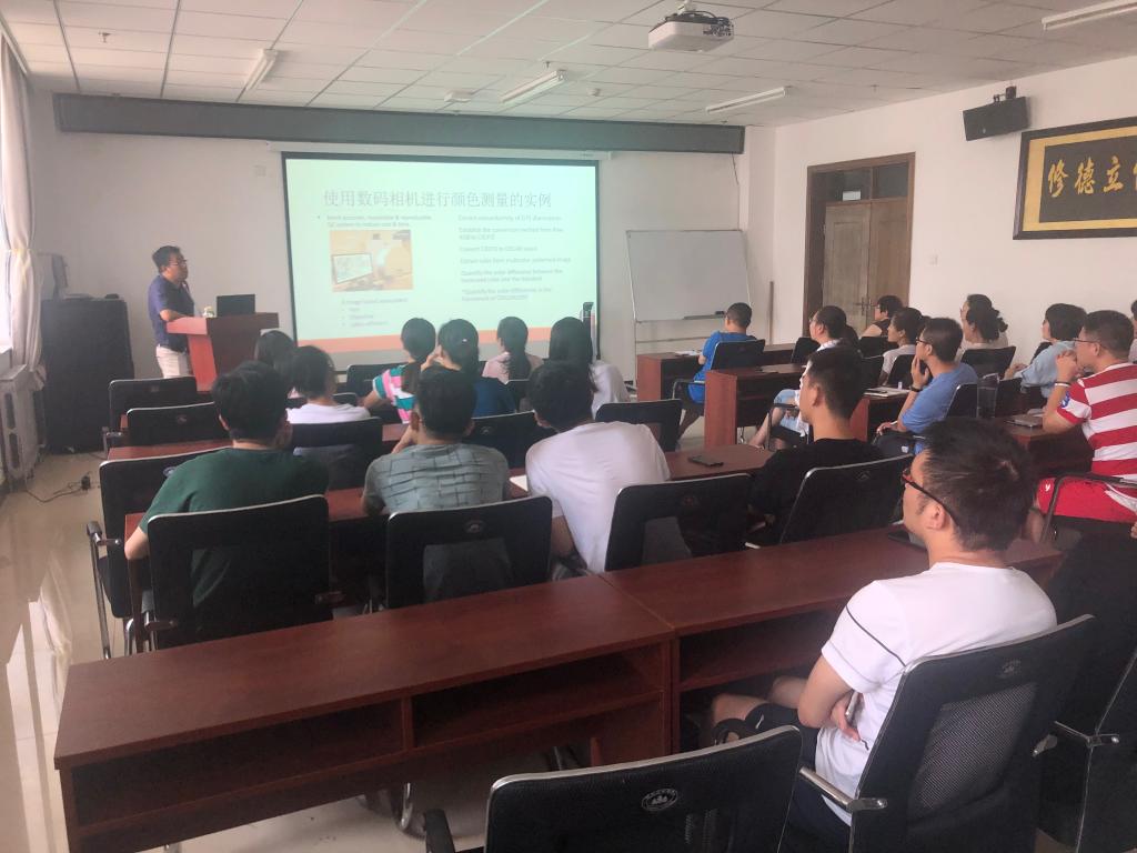 在报告中,林宇博士从颜色科学的基本原理开始,深入浅出,对颜色与视觉的关系、颜色空间、色差、色貌等概念都做了比较形象的讲解。并且以纺织品和化妆品为实例,对基于数字图像的颜色标准化测量做了重点讲解。使参加讲座的师生受益匪浅。会后大家踊跃提问,每一个问题林宇博士都耐心详细解答。