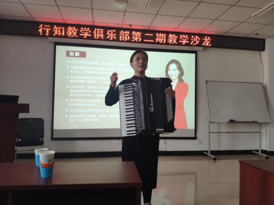 随后,张鹏老师使用手风琴用不同的演奏风格演奏《我和我的祖国》,向大家展示了日常工作中用嗓累的原因,并在说话节奏、音区、方式等方面讲解了如何正确用嗓,气氛轻松活跃。最后,柯枫老师通过演唱向大家展示了如何掌握气息,如何正确发声,强调在讲课过程中,教师要熟练掌握气息,通过科学护嗓、正确发声,摆脱职业病的烦恼,让老师在课堂上讲课更加清晰。在互动环节,广大教师积极参与互动,张鹏与柯枫老师耐心帮助大家,与会老师收获颇丰,反响热烈。
