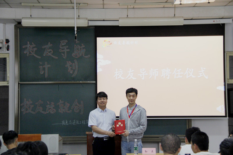最后,孙立和老师们一起寄语在场学生,希望同学们能够坚定自信,胸怀梦想,永葆激情,突破自我。学院党委书记曹凤才为校友孙立颁发了“校友导师”聘书。