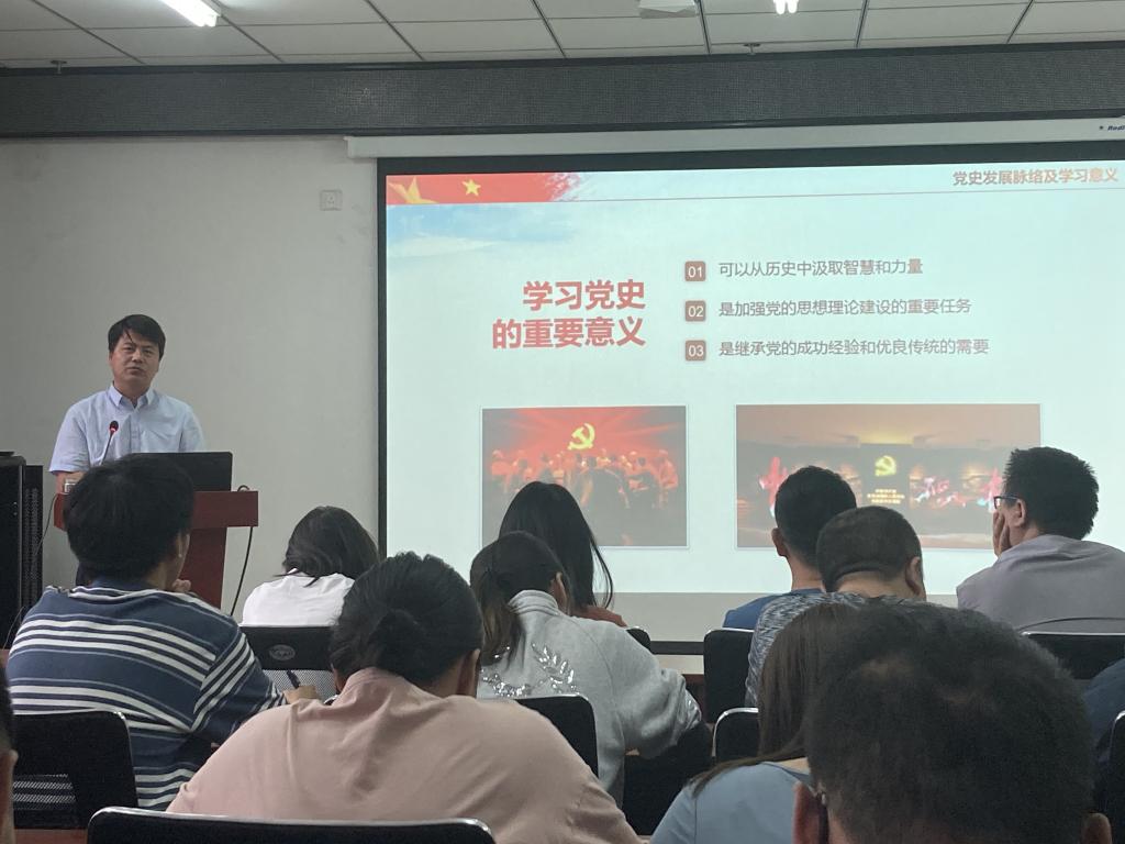 2021年5月25日下午,在科学楼B座715报告厅,校党史学习教育宣讲团成员、学院党委书记曹凤才为全院师生党员上了一堂生动的党史学习教育专题党课--党的百年光辉历程。全体党支部书记和师生党员代表参加了学习。
