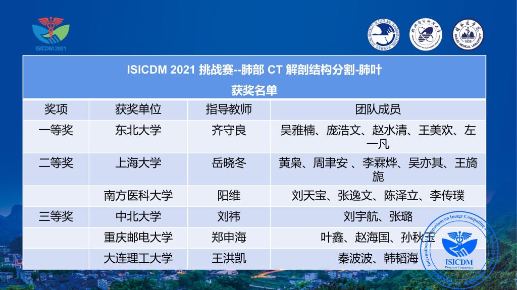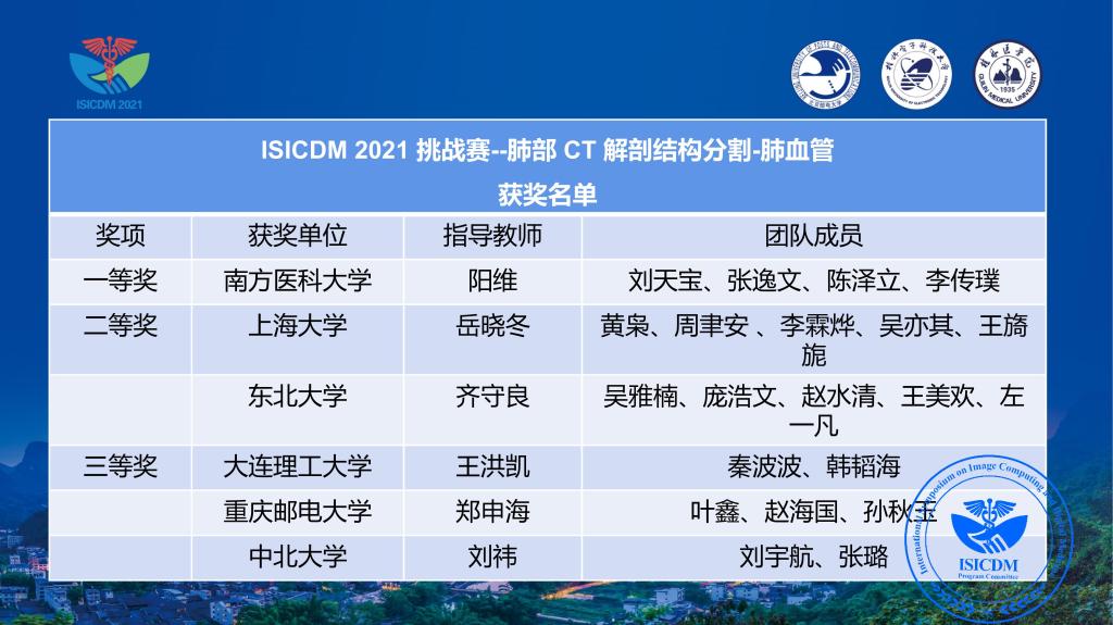 第五届图像计算与数字医学国际研讨会(ISICDM 2021)临床数据分析挑战赛决赛圆满闭幕,生物医学工程刘祎老师率领团队成员张璐、刘宇航在头颅 CT 血肿分割与血肿量计算、肺部CT解剖结构分割-肺叶/肺血管的三项比赛中均获三等奖。