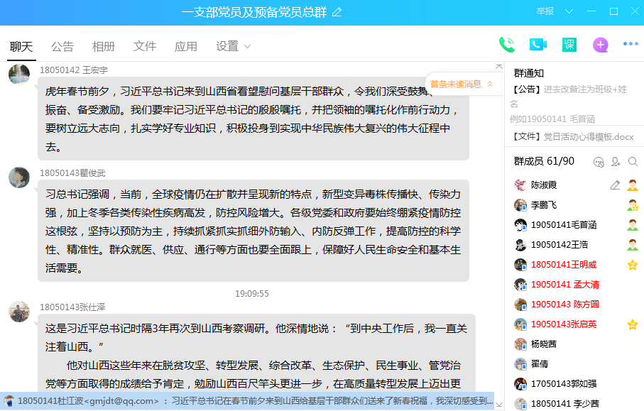 师生党员通过学习强国、新闻报道、微博等媒体深入学习习近平总书记重要讲话精神,拍下学习时的照片发至群相册,互相督促激励,及时记录学习笔记、撰写心得体会。习近平总书记在春节前来到山西,实地查看考察涉及人民群众切身利益的工作等,总书记这种时刻牵挂人民群众的“大我”精神,鼓舞着每个党员拼搏奋发的斗志。