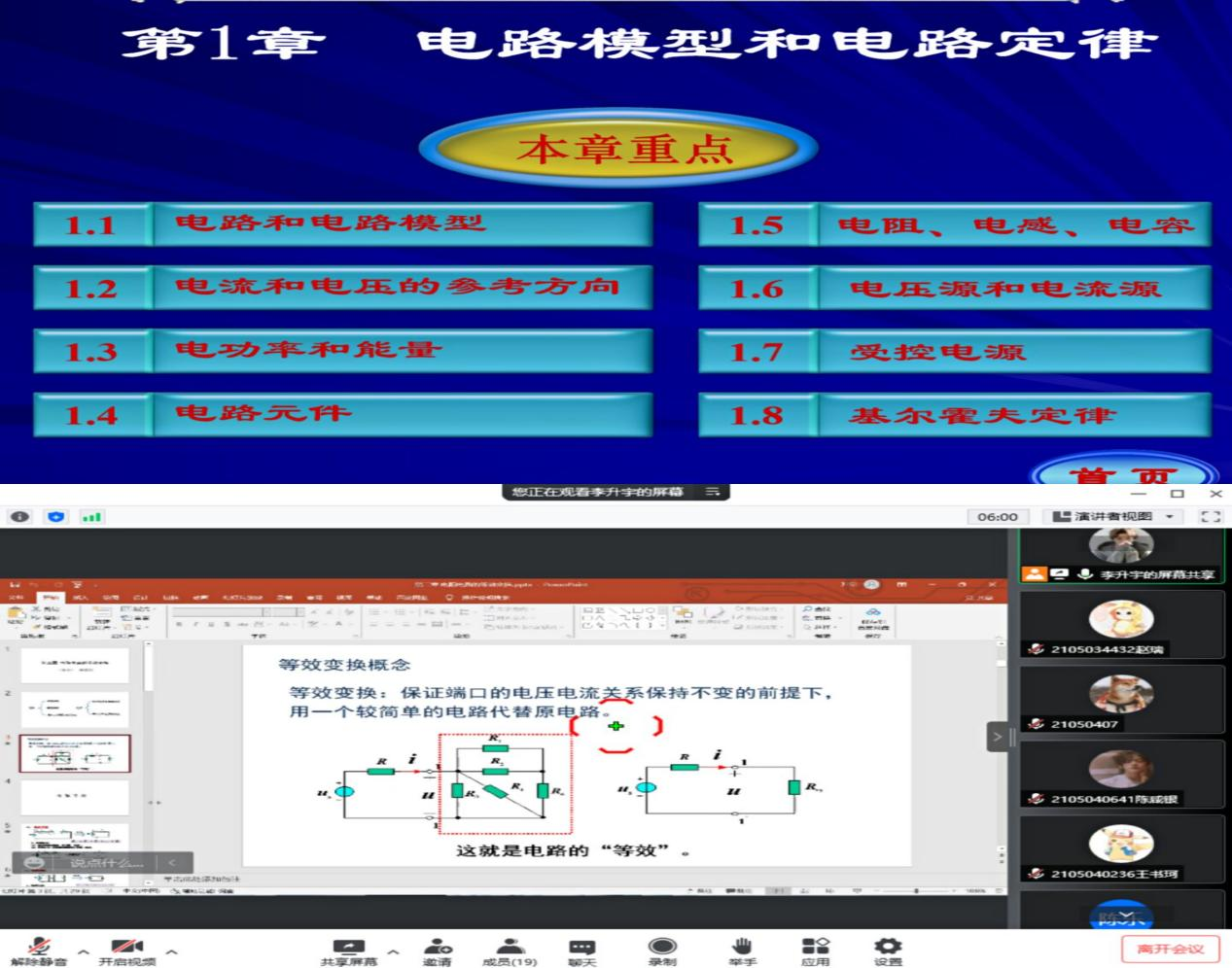 电路由李升宇和仇佳俊两位同学为同学们进行了重点知识的梳理以及例题讲解。首先讲解了电路的基本定律,并总结了常见的电路模型,使得同学们更好地理解相关抽象概念。之后分析电路例题,在分析中强调运用的知识点,同时将错误分析方法拿出来予以警示,帮助同学们把握正确的解题思路。最后,两位同学分享了电路相关练习,帮助同学们在课下巩固知识点。