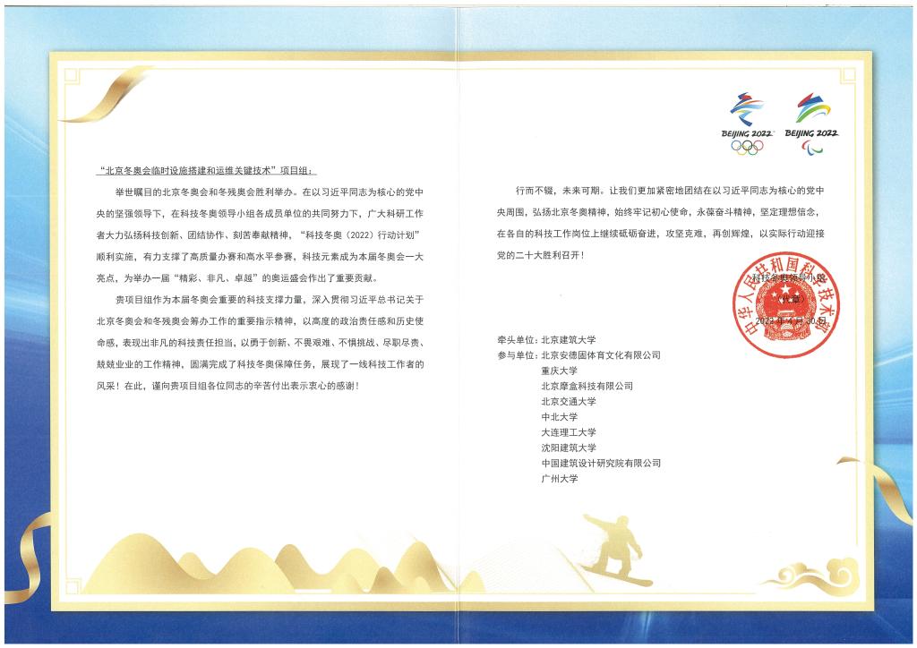 参与的“科技冬奥”重点专项“北京冬奥会临时设施搭建和运维关键技术”项目,做出的重要贡献表示感谢。