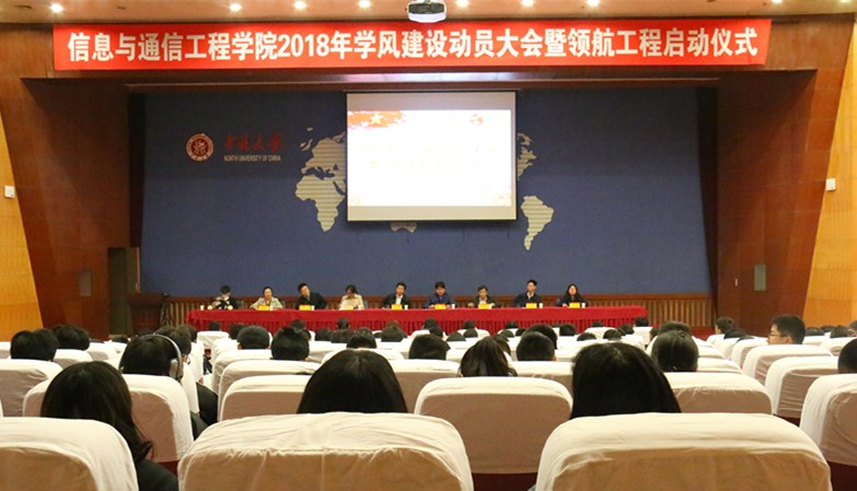 2018学风建设动员大会暨领航工程启动仪式在图书馆五层学术报告厅隆重召开。出席此次大会的领导有学院院长杨风暴、党委书记曹凤才、科研副院长王明泉、院党委副书记兼副院长魏媛媛、信息与通信工程学科管理部主任陈友兴、光学工程学科管理部主任程耀瑜、生物医学工程学科管理部副主任丁婷,学院全体辅导员和部分班主任代表也参加了会议。