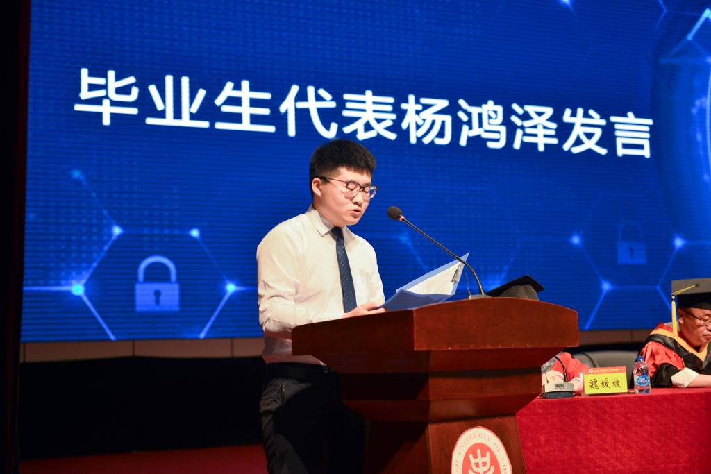 接着,校长奖章获得者保送至复旦大学的15050442班胡朝煜同学的母亲郭瑞英女士作为家长代表发言,代表家长表达了对学校辛勤培育的感谢和对学校良好发展的祝愿。教师代表李凯希望同学们勤奋学习、积极工作,在平凡的工作岗位上建功立业。毕业生代表杨鸿泽同学深切表达了对学院领导、老师的感激之情和对同学、朋友的不舍之情,一句“再见,同学;你好,校友”,让无数同学潸然泪下。在校生代表王艺璇同学表示将继承学长、学姐们的精神,报效祖国,回报社会,同时也祝愿学长、学姐们在日后事业中鹏程万里,前程似锦。