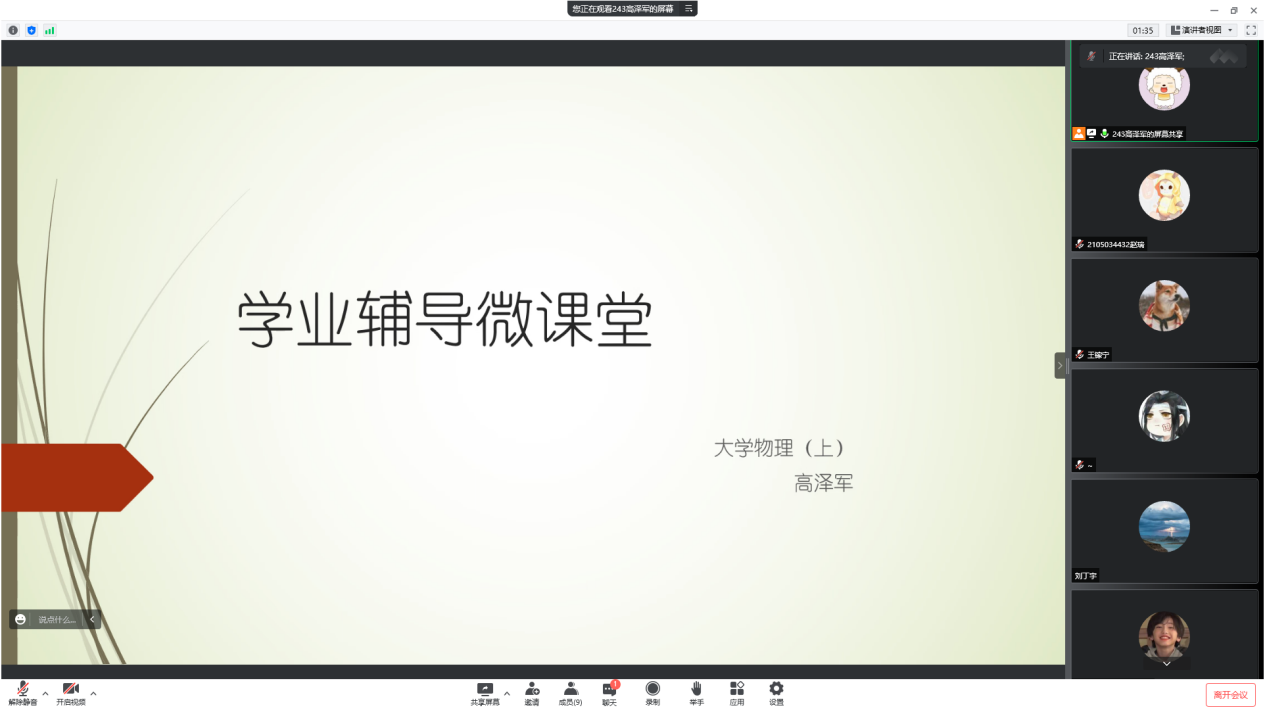 的学习氛围,提高同学们的复习效率,解答学习中的疑惑,助力同学们的期末备考。2022年5月21至5月28日,学生会学习部邀请到刘瑞、胡卓凡、范展前、李升宇、王梓翔、仇佳俊、刘嘉雨、高泽军共八位同学在腾讯会议上开展“筑梦起航”学风建设系列活动----第6期学业辅导微课堂。