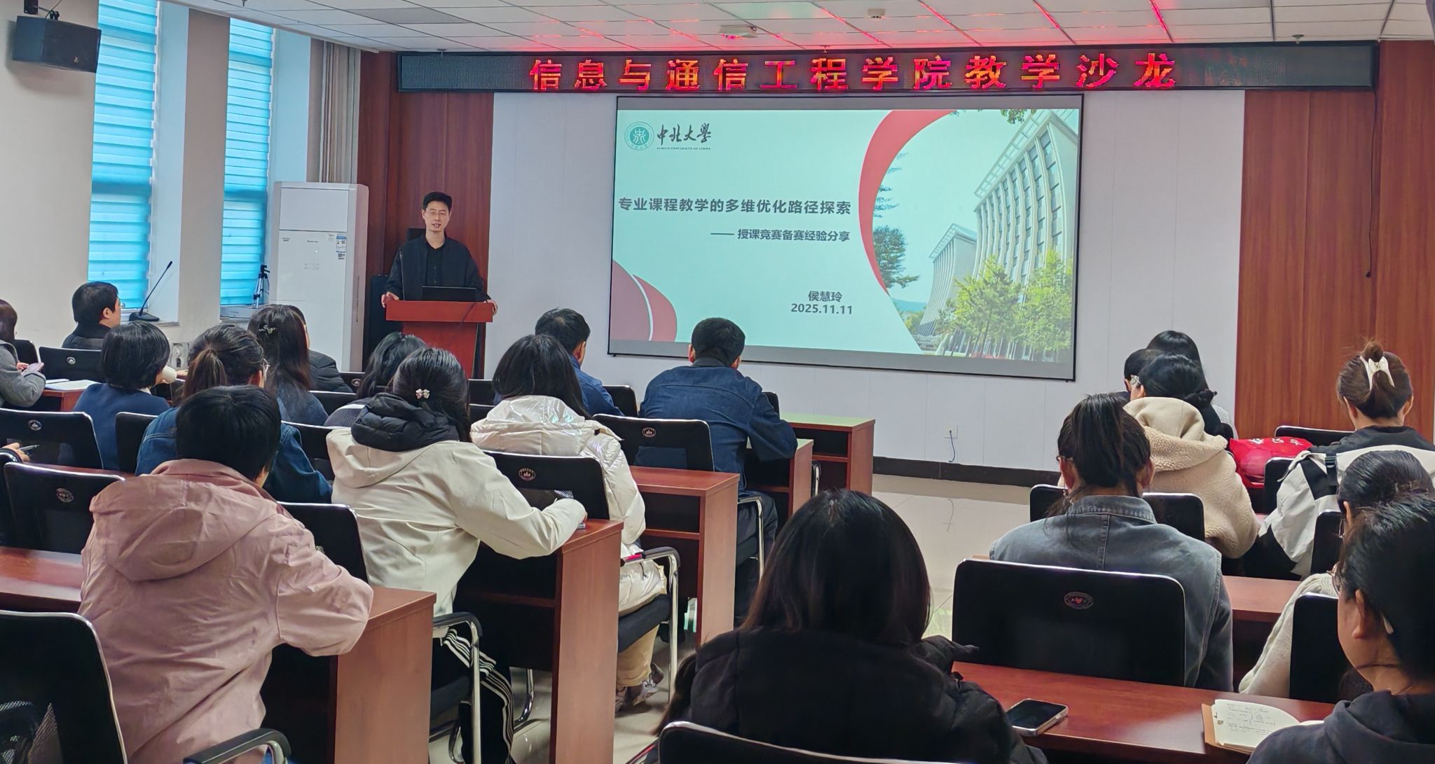 会上,侯慧玲结合其主讲课程《网络与通信》的丰富教学经验,结合授课竞赛备赛过程,系统阐述了如何在教学内容、方法、评价及资源建设等多个维度进行系统性优化与创新,就授课竞赛备赛经验为在座的老师进行了细致的分享,其分享融汇了深厚的理论功底与卓有成效的实践案例,为青年教师提供了极具价值的教学改革思路。