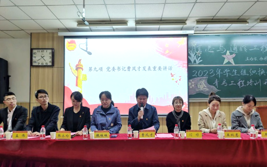 2023年度学生组织换任大会暨青马工程培训开班仪式在09102H教室成功举办。学院党委书记曹凤才、党委副书记兼副院长魏媛媛、团委书记闫婷、学生科张永玲老师、王秋惠老师、孟伟老师、王欣老师及本科生、研究生全体学生骨干及青马学员出席大会。会议由院团委王彪老师主持。