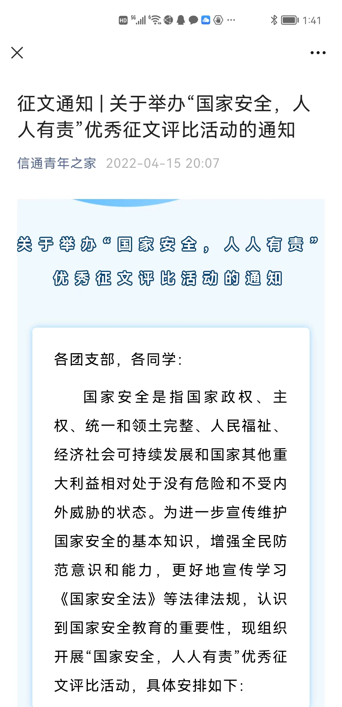 团委承办的“国家安全,人人有责”主题征文活动于4月15日开始举办,活动历时一周,现已完美落幕。