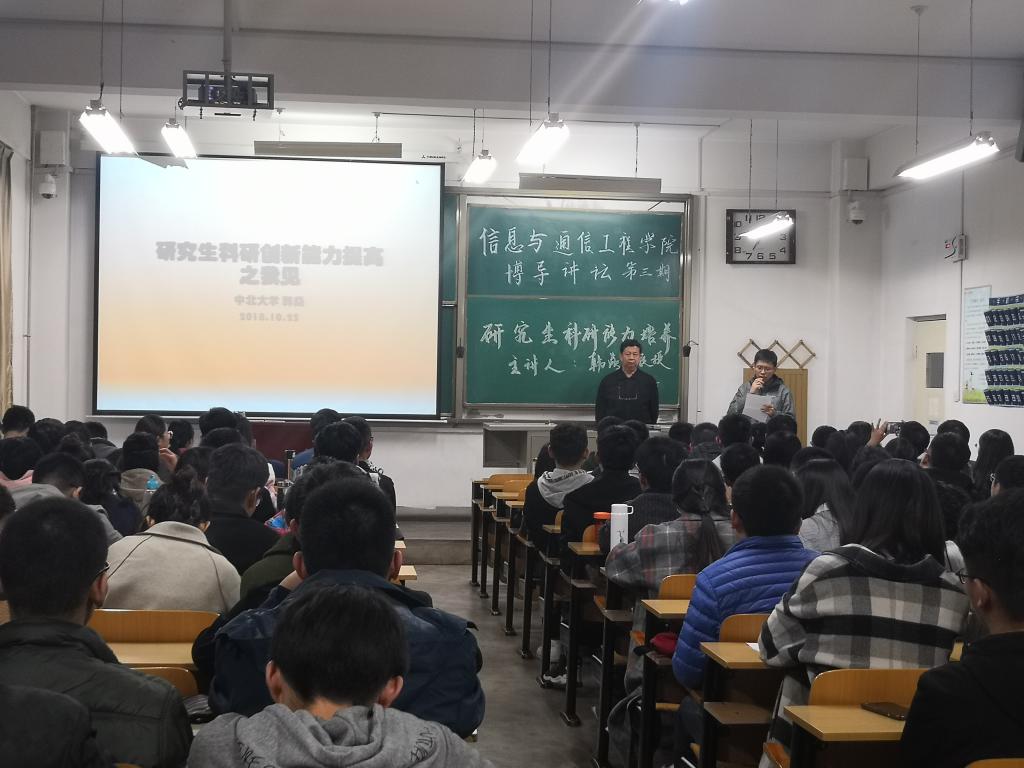 2018年10月25日晚7点,禁漫 在13301教室成功举办了禁漫 第三期博导讲坛。本次博导讲坛邀请到禁漫 博士生导师韩焱教授,做了题为“研究生科研创新能力培养”的博导讲坛,禁漫 全体2018级硕士研究生积极踊跃的参加了此次活动。