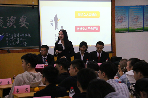 接着,八名辩手挽着胳膊共同走进这激烈的赛场,秉承“友谊第一,比赛第二”的理念,开始了这一场友谊赛。正反方以“撒娇女人会不会好命”展开辩论。