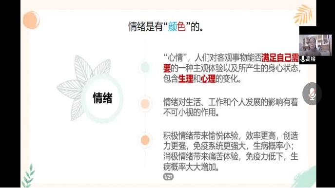 通过心理学知识以及心理调适的相关技巧,舒缓同学们因适应等问题产生的内在焦虑,提高同学们的适应能力,帮助同学们自我疏解情绪,并且认识到高中与大学的不同,学会人际交往,引领同学们能够拥有积极向上的人生观。