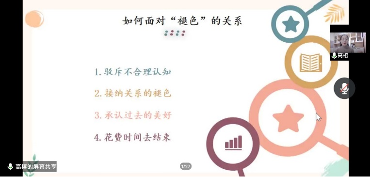 2022年10月25日,为帮助新生尽快适应大学生活,完成角色的转换。学院开展“大学生活,从心开始”新生心理讲座,本次讲座邀请到高榕老师,人大附中丰台学校心理教师,国家二级心理咨询师,北京市家庭教育指导教师,北京市丰台区心理辅导站辅导教师。获第十届北京市心理健康教育优秀成果二等奖、丰台区第七届育心杯心理教师基本功大赛一等奖。北京考试报、《中小学心理健康》杂志投稿作者。