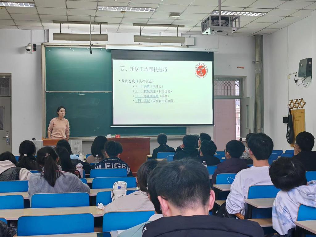 于11月14日下午11205H教室开展“托底工程”培训交流会,希望能够进一步夯实心理健康教育四级网络体系的基础环节,提高学生朋辈心理互助的能力与水平,更好服务学生成长。此次培训由王秋惠老师主讲,23级各班“托底工程”小组主要成员参与培训。