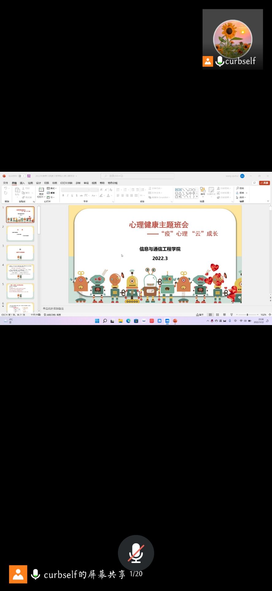 为进一步做好疫情防控背景下学生的心理问题疏导和帮扶工作,提高学生的心理调节能力,培养良好的心理品质,以积极心态科学应对疫情,4月中旬,学院面向本科生各班级开展““疫”路同行,守护心理健康”和““疫”心理 “云”成长”心理健康教育主题班会。此次心理健康教育主题班会的召开,有助于同学们养成积极乐观的心态,更有利于当前形势下禁漫