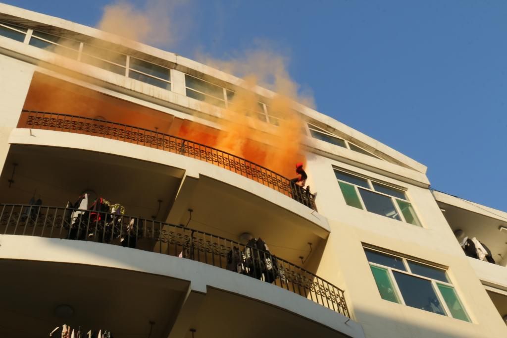 烟雾弹模拟火情发生,住在5楼的学生大声呼救,警报声响起,整个演练正式开始。演习过程中,同学们用湿毛巾捂住口鼻,低身有秩序进行撤离。在大家的通力配合下,所有参与演练的师生在规定时间内在指定地点集合,顺利完成本次演练。随后校医院田主任为师生们现场讲解了心肺复苏等紧急救护知识,并让同学们现场进行学习施救;最后校保卫处向远峰老师为大家讲解了有关灭火器的使用方法及注意事项并让大家实际操作。