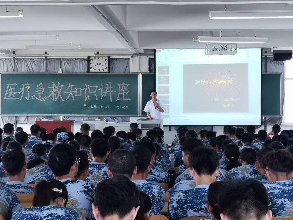 2018级参与军训的全体同学举办医疗急救知识讲座。