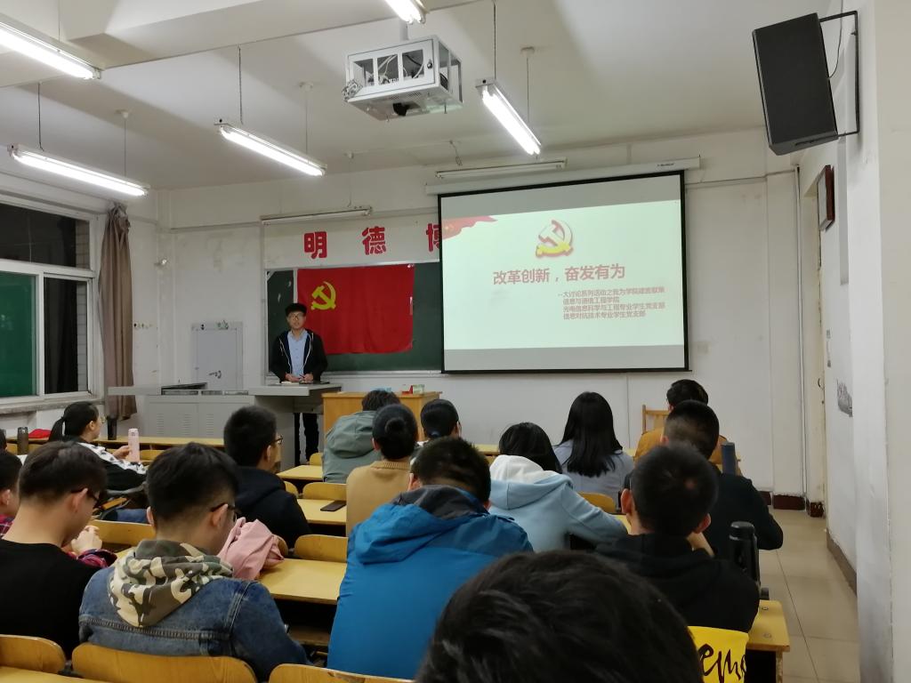 为了扎实推进改革创新,奋发有为”大讨论,2019年42下午禁漫 学生党支部在10206Z教室举办了我为改革创新做什么主题党日活动,会议光电信息科学与工程专业学生党支部副书记余成臻同志主持