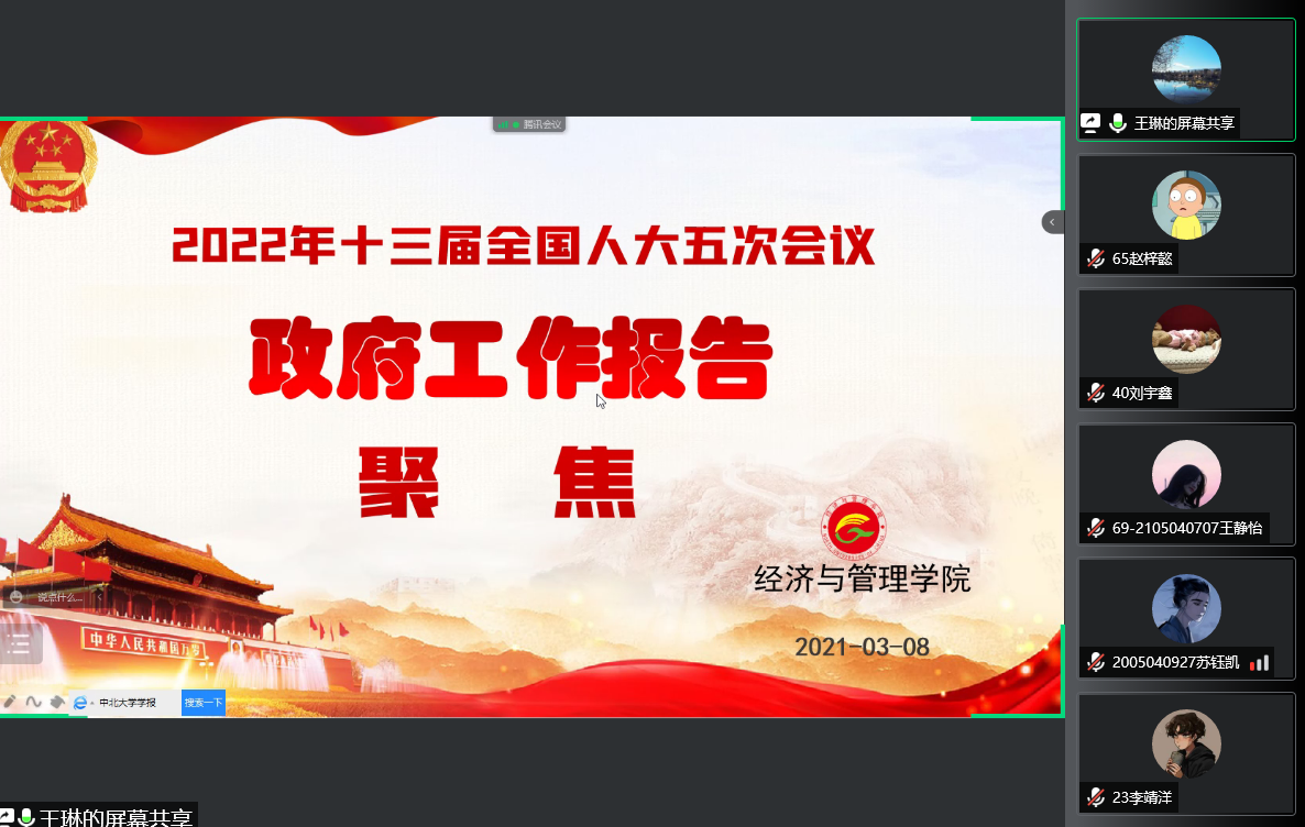 经济与管理学院党委书记王琳对全国两会精神进行了深入解读,王书记介绍了历届全国两会的主题、参会人员以及重要精神。她带领学员们展开讨论,大家表示对党的理论有了更加深刻的认识,决心要以积极向上的干劲迎接党的二十大。