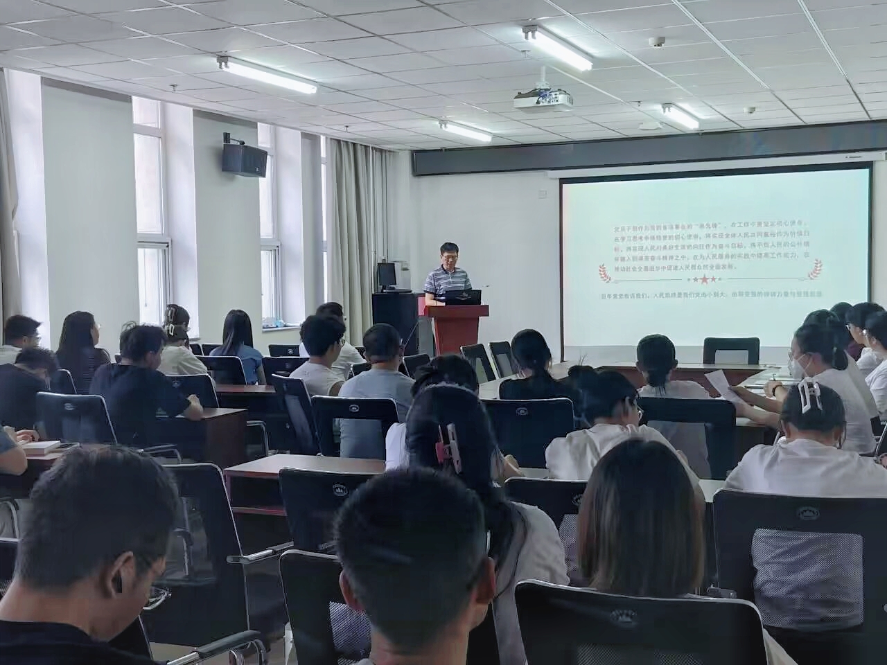 党支部书记郑志华老师以“全面把握‘三个务必’的深刻内涵”为主题展开了本次宣讲。他重点强调:“三个务必”既有对党的优良传统的坚定继承,又是基于党在新时代治国理政实践基础上的创新发展。广大党员同志务必不忘初心、牢记使命:务必谦虚谨慎、艰苦奋斗;务必敢于斗争、善于斗争。中国共产党已走过百余年历史,如今又迈上了全面建设社会主义现代化国家新的赶考之路。在这一历史关键时刻,中国共产党人要在新时代的伟大实践中全面把握“三个务必”的深刻内涵,继续开创下一个灿烂的百年辉煌。随后,郑老师带领全体党员认真学习了“浙江千万工程”和“浦江经验”等经验案例。广大党员同志深刻领悟到习近平总书记深厚的为民情怀,大家决心牢记“为人民服务”的宗旨,不断提升自己的服务意识和能力。此外,郑老师还强调各位党员要坚决防止形式主义坚决杜绝“低级红”和“高级黑”现象。广大党员必须增强政治意识,不断提高自身的政治鉴别能力。