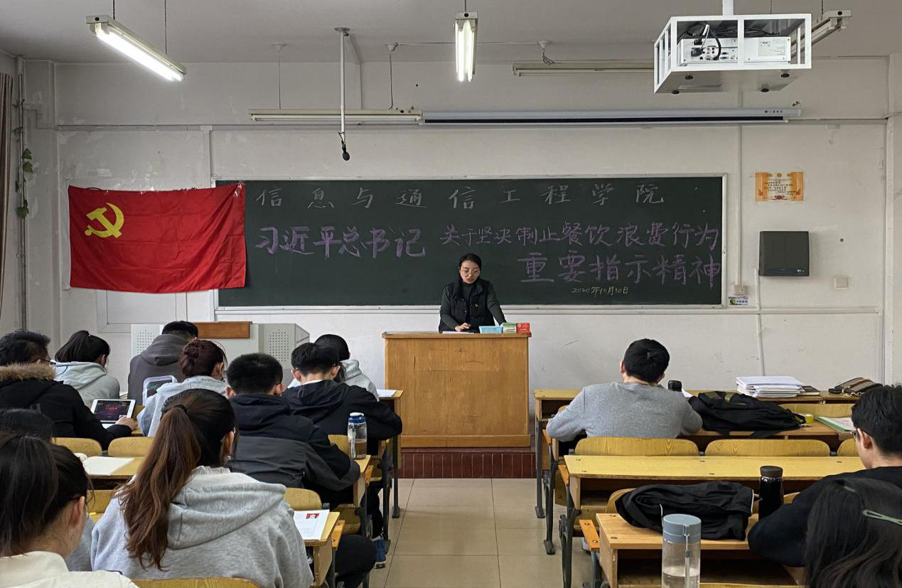 为切实抓好党员日常理论学习,进一步提高学习的针对性和实效性,2020年10月30日下午,通信工程专业学生党支部的党员们在支部书记闫婷老师的带领下,一同学习了习近平总书记关于坚决制止餐饮浪费行为的重要指示精神。
