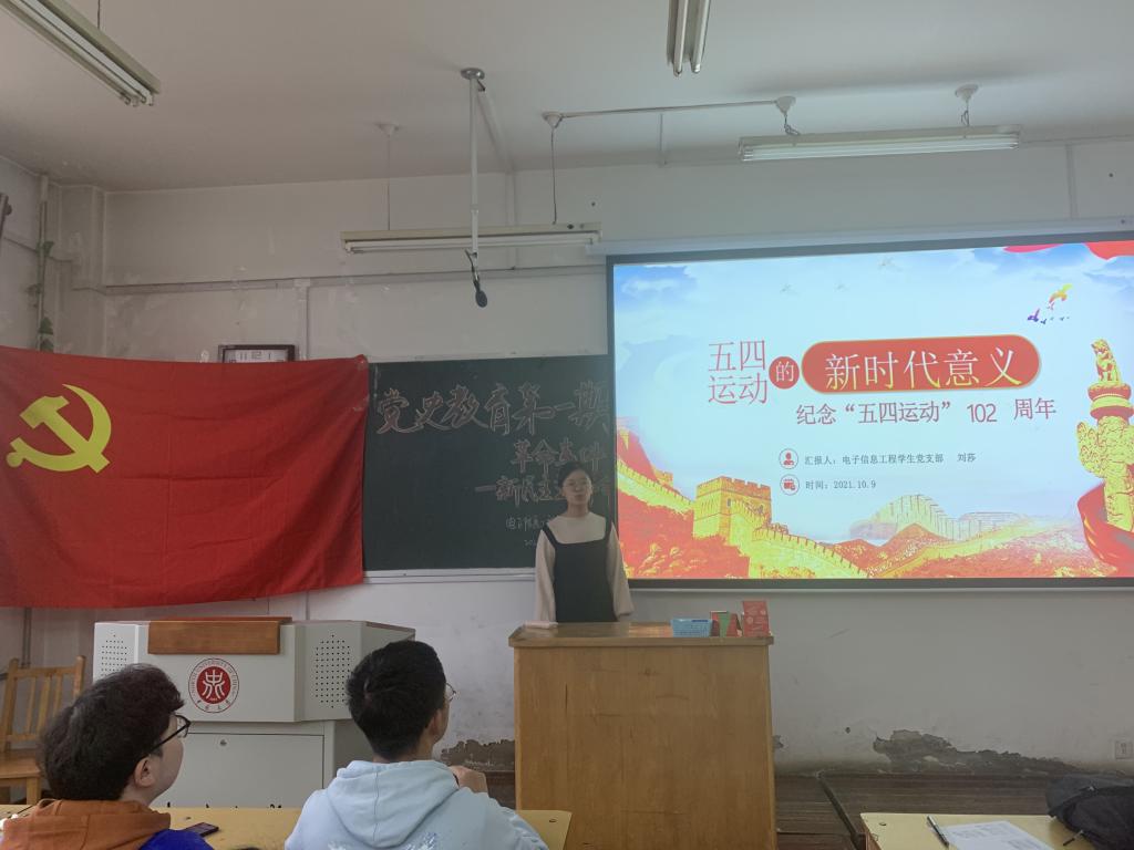 习近平总书记指出,只有坚持思想建党、理论强党,不忘初心才能更加自觉,担当使命才能更加坚定。本学期,电子信息工程学生党支部以党史发展的四个阶段为时间线,由党员、发展对象分组讲述新民主主义革命时期、社会主义革命和建设时期、改革开放和社会主义现代化建设时期、中国特色社会主义进入新时代四个阶段发生的重大事件,帮助学生党员系统学习党的光辉历程,从而达到学史增信、学史明理、学史崇德、学史力行的目的。