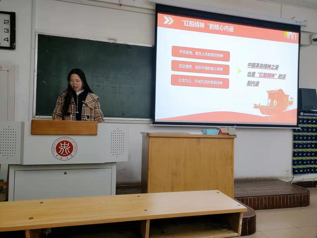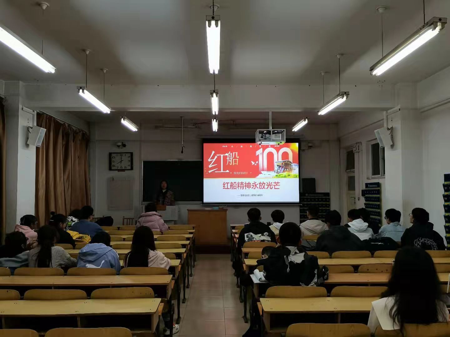 为持续推进党史学习教育在青年中走深走实,进一步强化青年思想政治引领。2021年10月29日第五学生党支部于10405H开展青春宣讲团讲党史活动,党支部的发展对象和积极分子参加了此次活动,本次活动以“红船精神”为主题让同学们对党有了更深入的了解,对中国革命精神有了更深刻的印象。