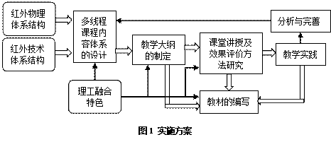 “创新内容体系,强化理工融合,改革《红外物理与技术》的研究与实践”的教学成果是在1个省级重点教改项目、1个省教育科学“十二五”规划项目、1个工信部“十二五”规划教材项目以及2个校级教改项目的资助下取得的。该成果针对单一课程内容体系无法满足理工融合型课程中多种融合方式实施的瓶颈问题,以《红外物理与技术》课程为切入点,以多线程结构为牵引,提出了一种理工融合型课程改革的实施方案,为类似课程的建设和改革提供了理论指导和实践参考。具体实施方案如图1所示。
