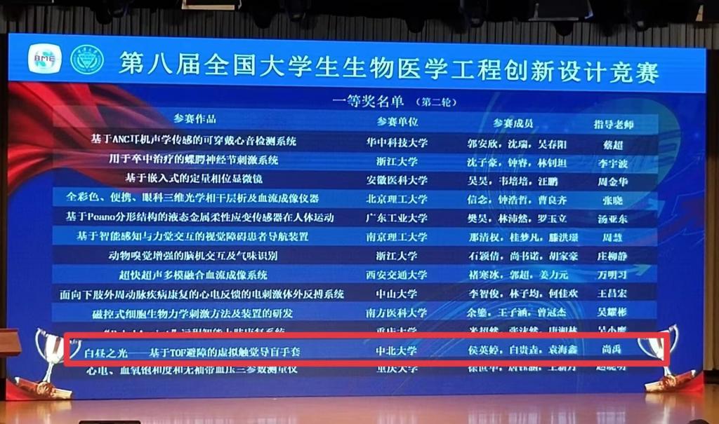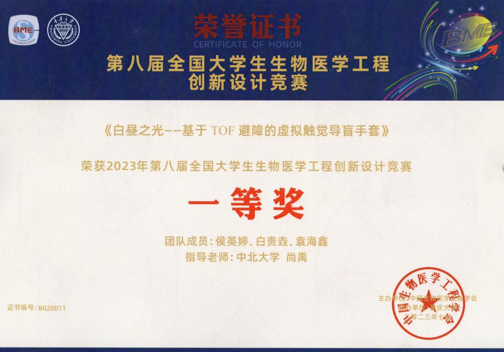 尚禹老师指导的《白昼之光——基于TOF避障的虚拟触觉导盲手套》项目,荣获本科生组国家级一等奖。此项赛事是面向生物医学工程专业本科生和硕士研究生的国家级竞赛,禁漫