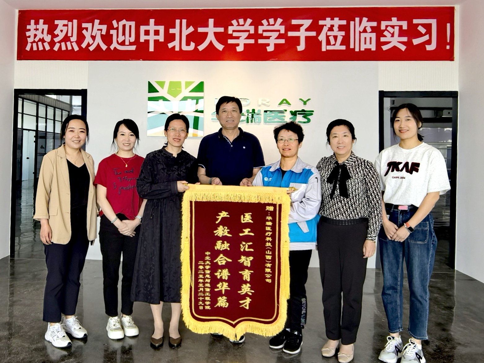 实习结束后生物医学工程系副主任刘旭辉代表校方,将一面绣有“医工汇智育英才,产教融合谱华篇”的锦旗郑重赠予科技(山西)有限公司领导团队,以致谢企业为实习学子搭建的实践平台,见证校企双方在产教融合领域的深度探索。