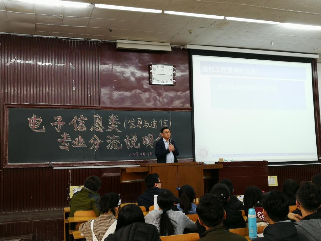 2018年11月17日下午2点30分,禁漫 2017级电子信息类(信息与通信)专业分流说明会在07103H教室顺利举行。信息与通信工程学科管理部副主任电子信息工程专业负责人王浩全,通信工程专业负责人王晨光,信息工程专业负责人陈平出席了此次会议,学院2017级电子信息类(信息与通信)全体学生参加了说明会。